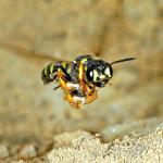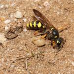 Nests are deep burrows dug in the soil, from which side-tunnels radiate leading to cells at depths of 20-25 cm. In sandy areas, dense aggregations containing thousands of nests may form. Each cell is provisioned with 3-14 prey, the number depending on prey size and sex of offspring. A colony of 1000 nests must cull around 100,000 weevils each year (Willmer, 1985a). Paralysed weevils are carried in flight, and are probably stored temporarily somewhere in the burrow until enough have been accumulated to fill a cell. The prey are then moved into a cell and an egg laid on one of them. Nests are left open and unoccupied through most of the day, and nest-less ‘searcher’ females often usurp them. Some searchers, on entering a nest, immediately close it at the entrance with a plug of soil: when the owner returns, she tries to dig through the closure, but sometimes fails to do so. The old owner then becomes a searcher, and has to find another female's nest to usurp, or occasionally that of a different species, such as the bee Dasypoda hirtipes. Some 10-15% of nests are usurped each day, each nest being sequentially occupied by many different females. Usurpers are not always successful, however, and may be evicted or killed by the owner (Field & Foster, 1995).