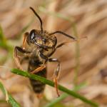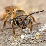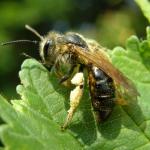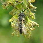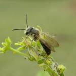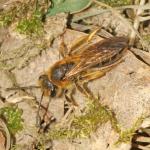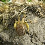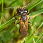 R C L Perkins (1917) was the first to describe the unusual nesting behaviour of this bee. Nests occur in compact aggregations with a single, common entrance. Numerous females enter and leave by this burrow and at times incoming individuals laden with pollen queue on the wing until they can gain access to their nests.The internal architecture of such nest clusters remains unknown but it is assumed each female has her own nest burrow. Nests are commonly excavated in a steep bank or hillock, but bees have been seen flying deep into a rabbit burrow (pers. obs.). In an Oxfordshire site, C O’Toole located 24 such communal nests within a short distance of each other, one having a population of 234 females (O’Toole & Raw, 1991).These nests were found by O’Toole to be perennial, persisting for at least four years. A similar nesting habit has been reported for the closely related Andrena ferox Smith and some A. carantonica Pérez (= A. scotica Perkins). Males have been noted in large numbers coursing along the tops of a maple hedge in Somerset (S P M Roberts, pers. comm.) and a similar situation in south Devon (pers. obs.), whereas in some other sites they tend to occur singly, occasionally settling on sunlit leaves.