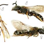 At least one of the Chudleigh populations nested in a loose aggregation (Perkins 1919b). The very characteristic burrow entrances were described by him as being scattered over three or four square metres. The diameter of each burrow appeared small for the size of the bee and the excavated spoil lay around the entrance, not heaped above it. On digging out a specimen it was found that the upper section of the main burrow was constricted and it was in this part that the female guarded her nest, her head exactly filling the entrance. So tight was the opening that a pollen-laden female returning to her nest deposited a ring of pollen around the burrow mouth, this being accidentally scraped off her hind legs as she entered. The female's large head and narrow, cylindrical body are presumably adaptations for such a nesting habit. This is a eusocial species, with a worker caste. The nest architecture and habits are described by Wu (1960), Westrich (1989) and Pesenko, Banaszak, Radchenko & Cierzniak (2000).