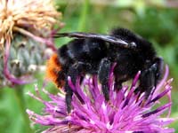 A cuckoo bumblebee Bombus rupestris. This bee invades the nests of Bombus lapidarius, usurping the social bee queen. The host worker bees bring up the cuckoo's offspring.