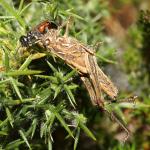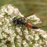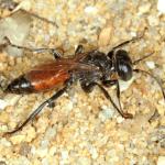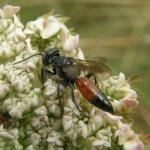 A female Tachyspex pompiliformis excavates a burrow then catches and paralyses a meadow grasshopper Chorthippus parallelus and somehow manages to drag this huge prey item to its nest. After pulling it down the burrow she lays an egg on it and then seals up the entrance. Her larva will then devour the unfortunate grasshopper. Video by John Walters