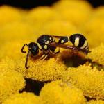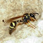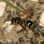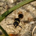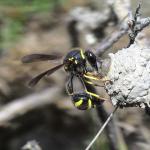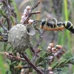 After mating the female selects a source of water and a quarry site for clay, which she uses for the construction of all her pots. If the water source dries out during the summer she will select another. Nest construction begins with the female visiting the quarry and water source. She does not collect soil but will land and test the soil with her mouthparts. She then flies slowly through the vegetation stopping occasionally to test the stems of heathers, gorse and grass stems for suitability as a nest site. When a site is selected the wasp spends a few minutes working at the point that the first mud will be placed with her mouthparts, cleaning the surface; she sometimes wets the stem to enable her to remove loose material. She then collects water and returns to the quarry. Water is added to the dry clay soil to form a small ball of mud that is held in the jaws and forelegs. This is carried to the nest site where building commences. Nest sites range between 0.5 and 126 metres from the quarry with most between 20 and 40 metres away The wasp usually flies 1–2 metres above the ground but in very warm conditions she will fly at a height of 15–20 metres. Each pot takes 1.5–3 hours to build in optimum conditions but nest construction is often delayed by bad weather and can take several days to complete. Between 22 and 28 balls of clay are used to construct each pot. During construction the wasp will replenish her water supply after about every two visits to the quarry. When the soil at the quarry is damp after rain the wasp will collect mud directly from the quarry without visiting the water source. When the pot is completed the wasp will sit in vegetation near the pot for a few minutes before returning to lay a single egg in it. Egg laying takes about 2 minutes. The egg is suspended by a short strand of silk from the wall of the pot. Egg laying may be delayed until the following morning if the pot is completed very late in the day. The egg hatches after about 3 days. The wasp then hunts for caterpillars and have been observed searching on heather and gorse flowers. The caterpillar is pulled from its hiding place and stung several times. Then it is passed through the jaws and each segment bitten lightly. The wasp then holds the caterpillar in her jaws and first two pairs of legs and flies to the pot. The caterpillar is pushed in using the jaws and forelegs. Between nine and 38 caterpillars are used to provision a pot. The wasp usually returns to the pot with a caterpillar about once an hour. If a good hunting-ground is found the wasp will return to it several times in quick succession. Provisioning usually takes 2–3 days but can be completed in 3.5 hours if conditions are favourable. In unfavourable conditions provisioning can take a week or more. If bad weather prevents provisioning, the Eumenes larva may die and the pot fail. The pot may also fail due to parasitism, e.g. by the sarcophagid fly Amobia signata (Meigen). The wasp frequently inserts her antennae in the pot entrance during the provisioning stage. If the larva has died, provisioning ceases and the wasp returns to the quarry to select a new site.