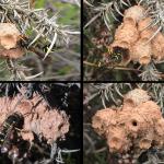 When the pot is full the wasp returns to the water source before collecting a small ball of clay to seal the entrance. Occasionally two balls of clay are used. The wasp then checks the outside of the pot with her antennae. The wasp often flies away from the pot and returns to check its surface several times before finally leaving it. Occasionally a second pot is attached to the first. Higher multiples of 3-8 have been recorded. Multiples of 3 or more are almost always built during September and early October. Presumably time is saved by cutting out the searching phase at this time of year. During her lifetime, which usually lasts for 2–3 months, a female builds and provisions about 25 pots.